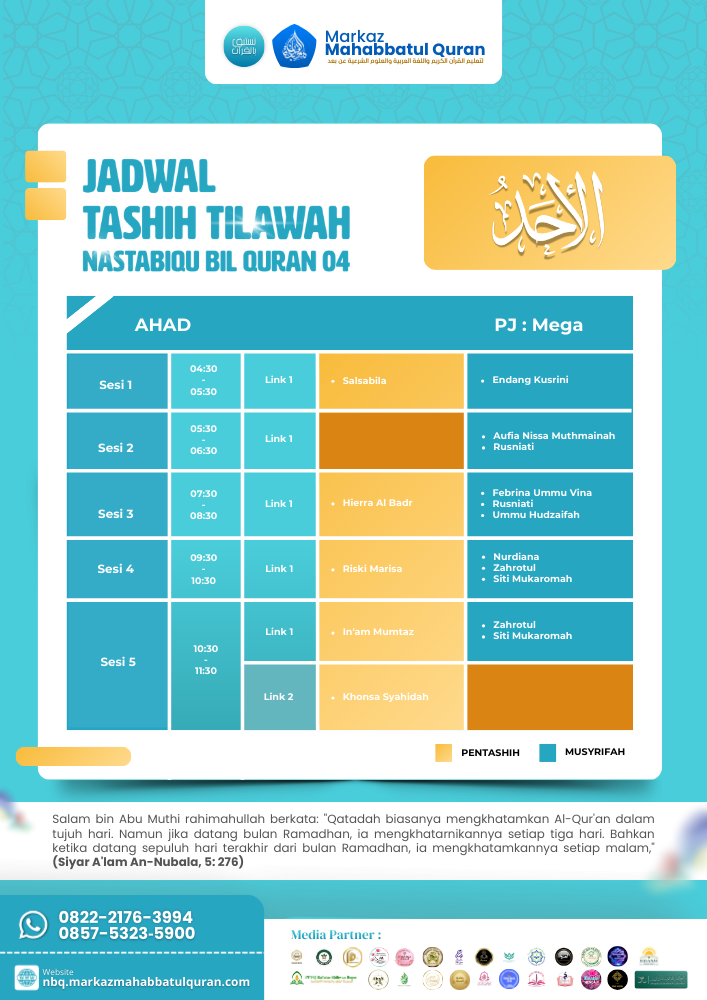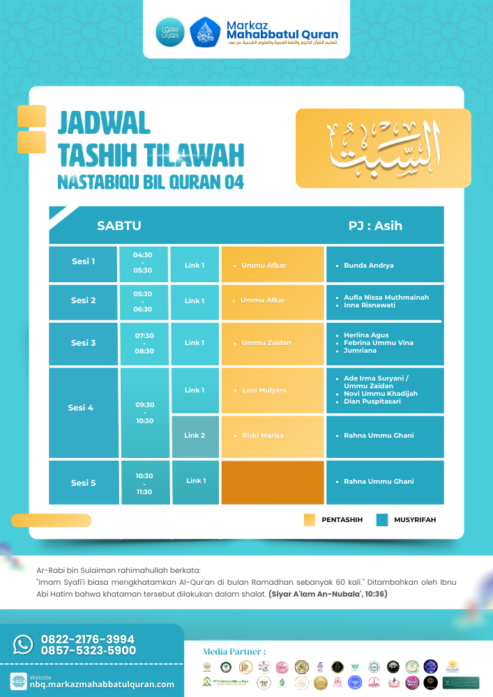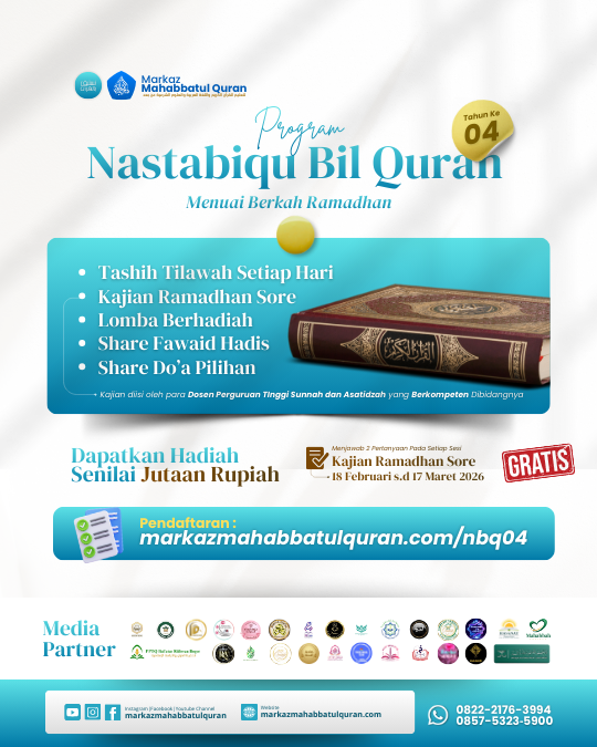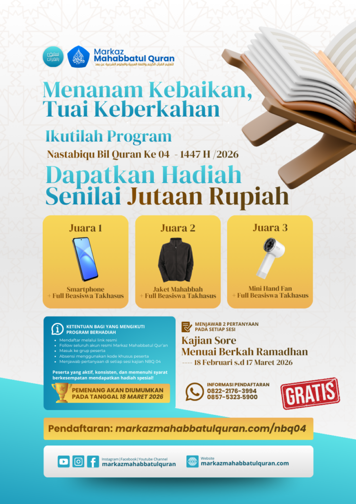 Program ini mengajak peserta untuk mengikuti kajian sore dan menjawab pertanyaan di setiap sesi, dengan kesempatan mendapatkan hadiah senilai jutaan rupiah. Dilaksanakan pada 18 Februari – 17 Maret 2026 (1447 H), program ini gratis dan terbuka bagi yang ingin mengisi Ramadhan dengan ilmu dan Al-Qur’an.